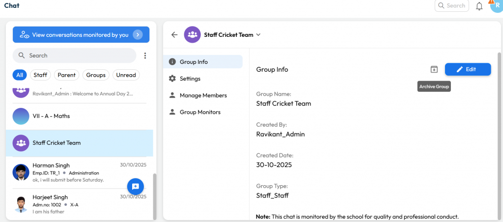 Benefit : Helps schools maintain oversight and quality control by allowing additional staff—beyond admin or principal roles—to monitor assigned conversations and keep a bird’s-eye view where needed.