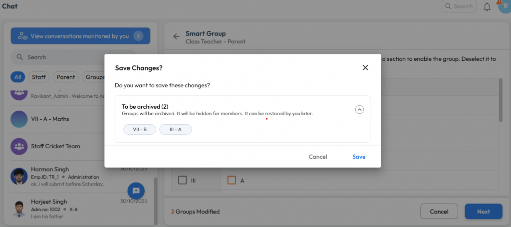 Chat Icon > Smart Group > Class-Teacher or Parent-Teacher > Unselect mapped Class-Section > Next > Save