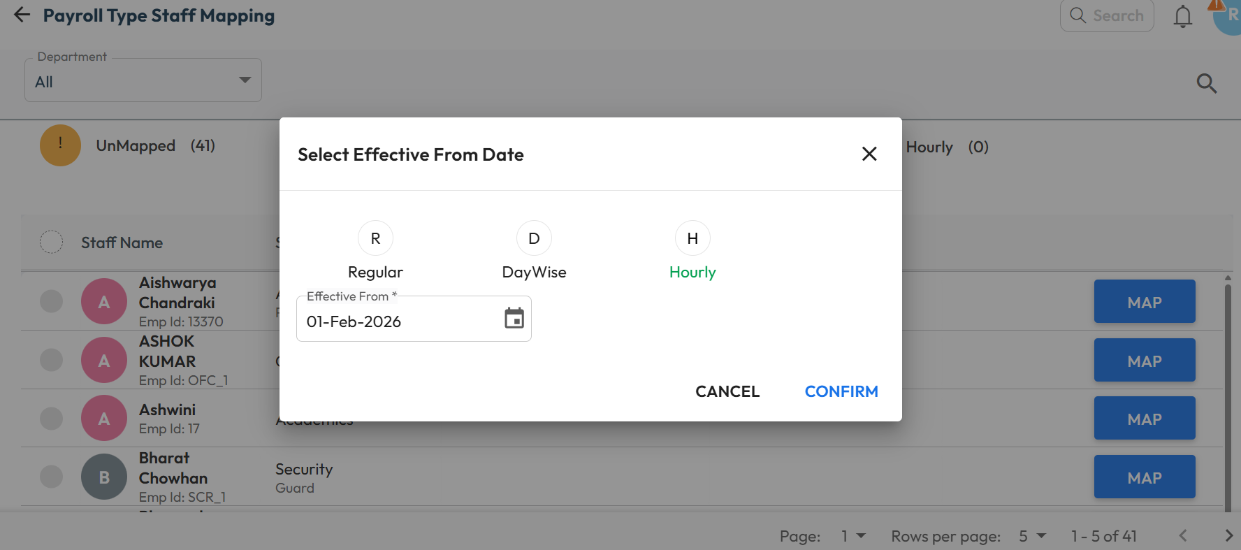 Path : Settings > Finance > Payroll > Payroll Type Staff Mapping > Map/Edit > Select Regular / DayWise / Hourly > Enter Effective From Date > Confirm