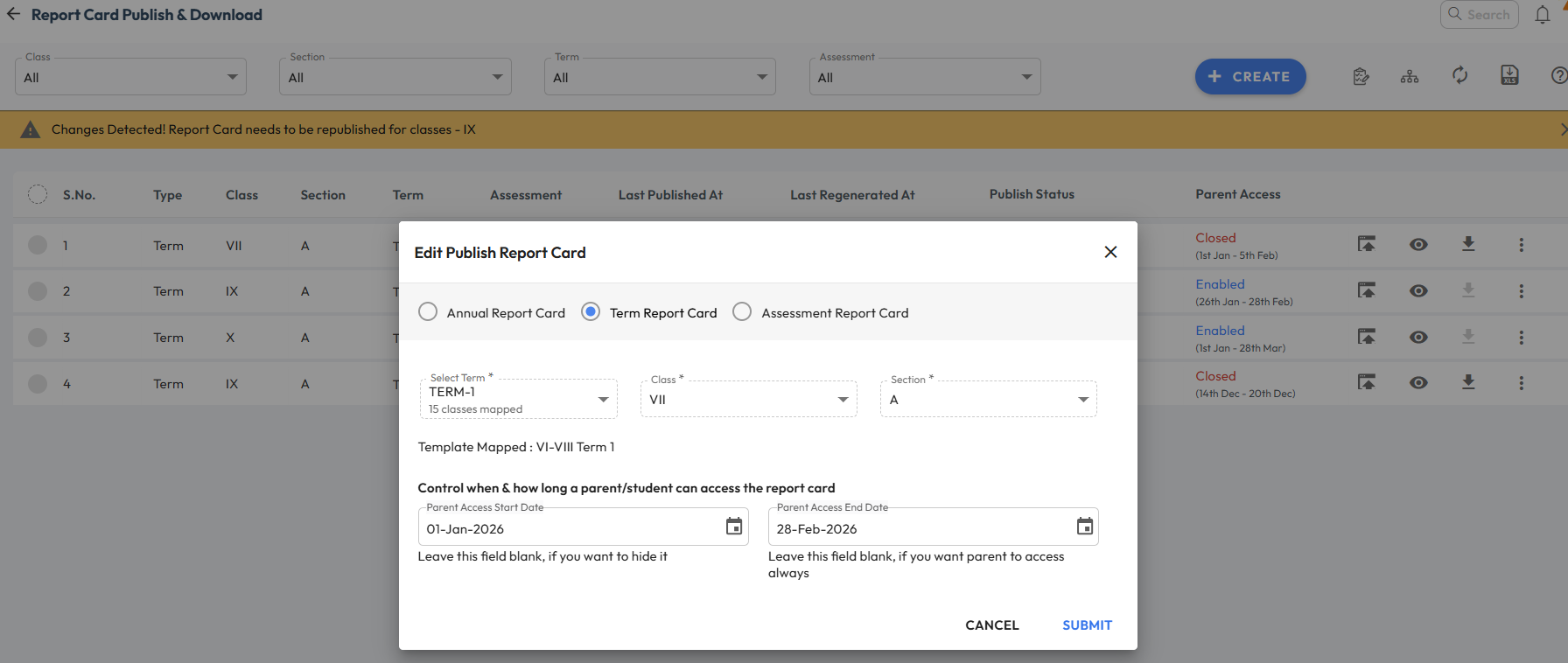 Benefit : Provides better clarity and control while enabling report cards for parents. Clear status indicators help users easily understand the current stage and visibility of each report card.