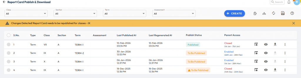 - Clearer Report Card Status: Earlier, Generated and Published statuses were used to differentiate school and parent access. Now, the report card status is shown as Published, while parent access is tracked separately in the new column.